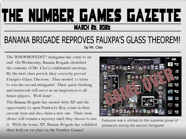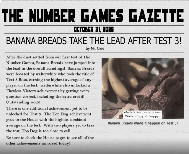 Test 5 is finally (almost) in the books. There were some extremely high scores on the test, which consisted entirely of proofs. There were no Flawless Victories, but three players came within 1 point of a perfect test! Because three or more players earned the top score, no Test 5 Boss achievement was awarded. I was, however, able to award the Top Dog achievement to the Banana Breads for earning the highest House average on the test! Well done!