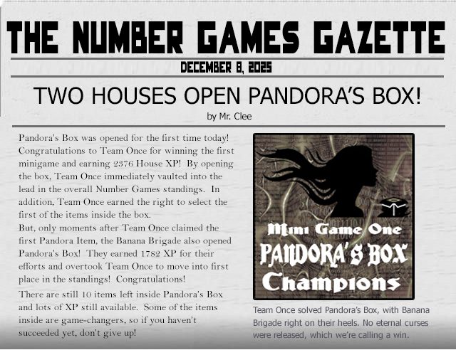 Several of the prizes inside Pandora's Box are game-changers. When you see them, you may ask, "Why would you put such a thing into this game?" Answer: "Why wouldn't I put such a thing into this game?" All Houses are very much still in the running to becoming this year's Number Games Champions. Good luck with the first minigame!