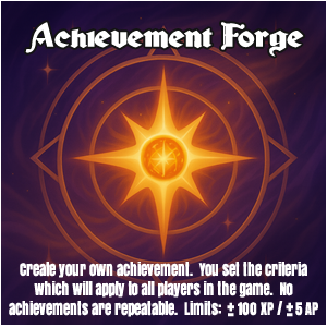 The Achievement Forge item has been used for the first time! The House holding this item has designed an achievement. All criteria for activation and XP/AP totals have been set at their discretion. When a player (or House) meets that criteria, they will unlock that achievement.