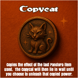 The Copycat item copies the effect of the last Pandora item used by another House. If the copied Pandora item is a rechargeable item, the copied effect may be used once, after which it disappears. If the copied Pandora item is a constant-use item, the copied effect may be used indefinitely until Copycat is recharged and used again. Copycat can store the effect of only one Pandora item at a time.