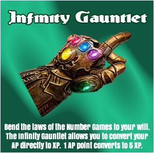 The Infinity Gauntlet allows players to convert each AP point directly to 5 XP points. As I have said before, some of the Pandora items are game-changers. Be sure to refresh your pages often to see the latest updates to walls and achievements. There will always be a degree of delay, but I will try to update things as fast as I can. |